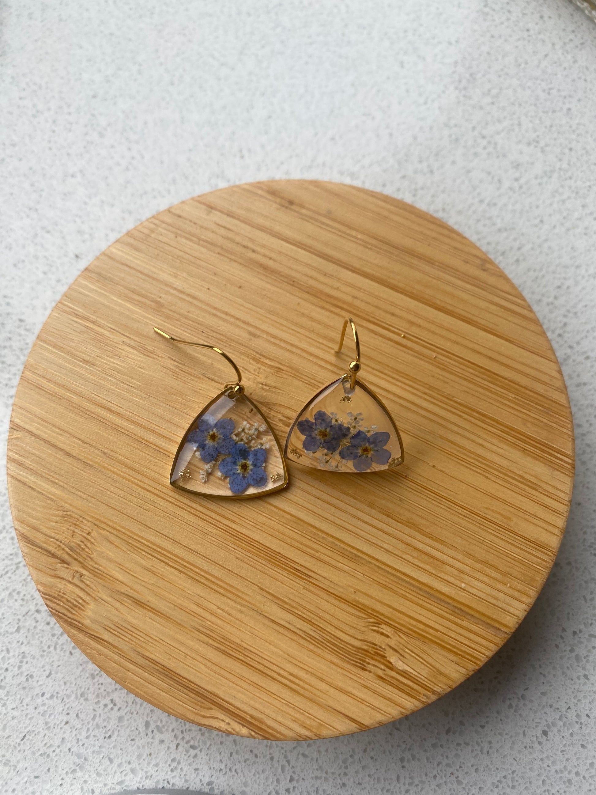 Su diseño triangular, enmarcado en un delicado tono dorado, encapsula flores azules y blancas preservadas, creando una pieza elegante y etérea.