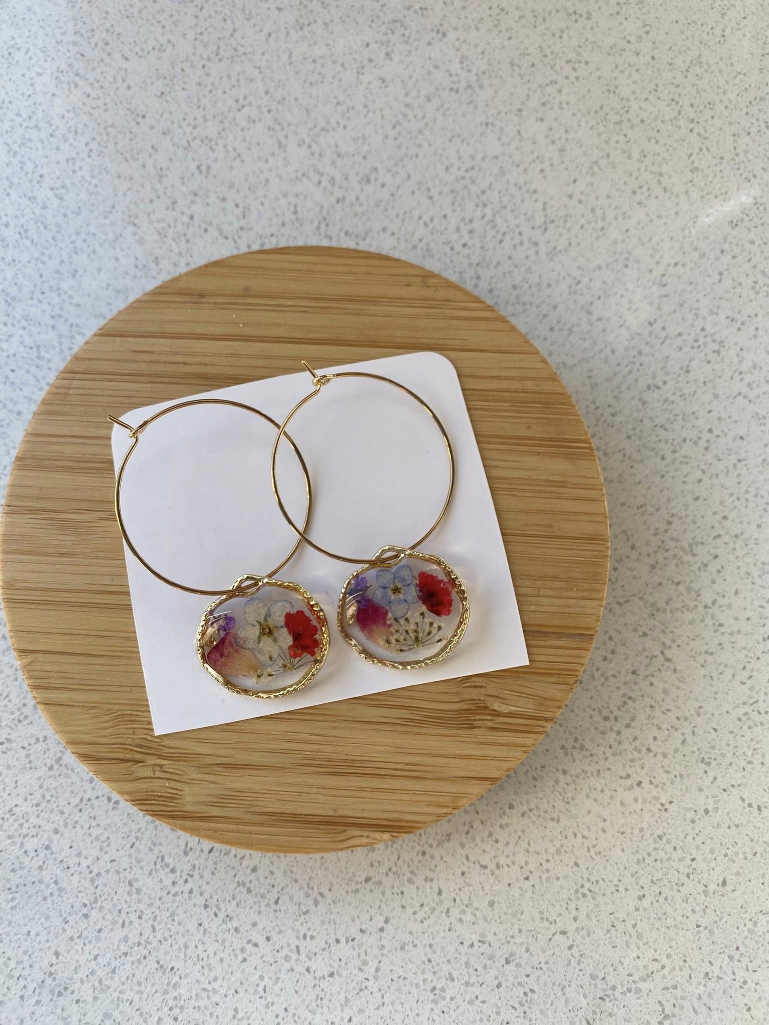 Lleva la belleza de la naturaleza siempre contigo con estos delicados y románticos aros. Cada aro de argolla dorada está adornado con un dije ovalado que encapsula una selección de flores y pétalos naturales, creando una pieza única y llena de vida.