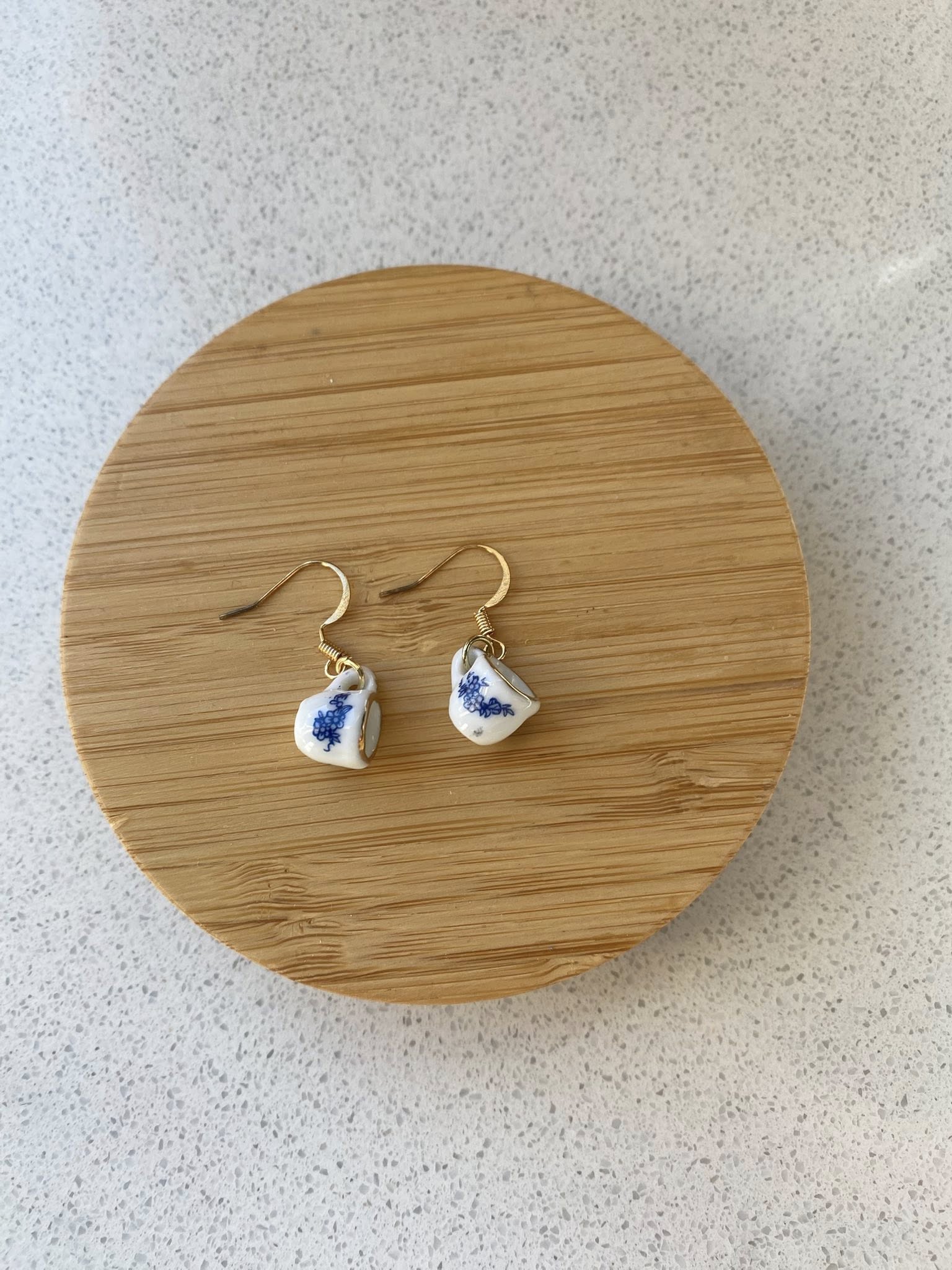 Añade un toque de encanto vintage y originalidad a tu estilo con estos adorables aros. Cada aro presenta una pequeña réplica de una taza de té de porcelana con delicados detalles en color azul, evocando la elegancia de la vajilla clásica en una escala diminuta.