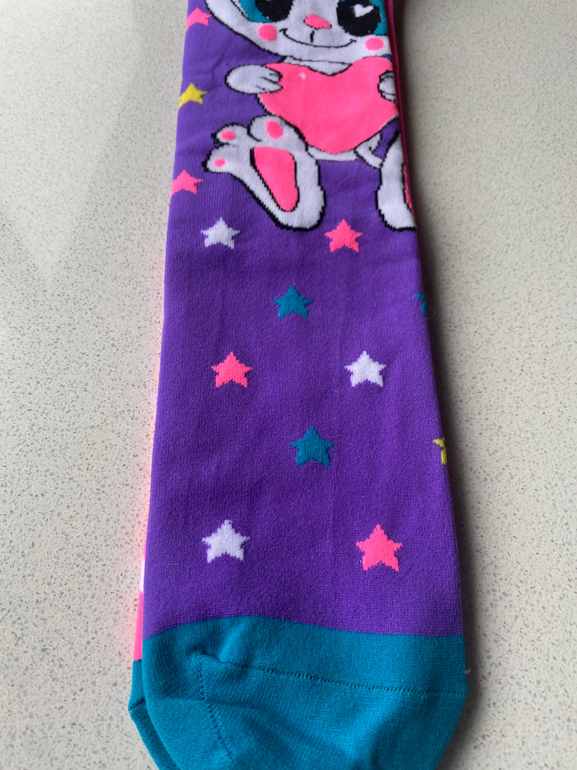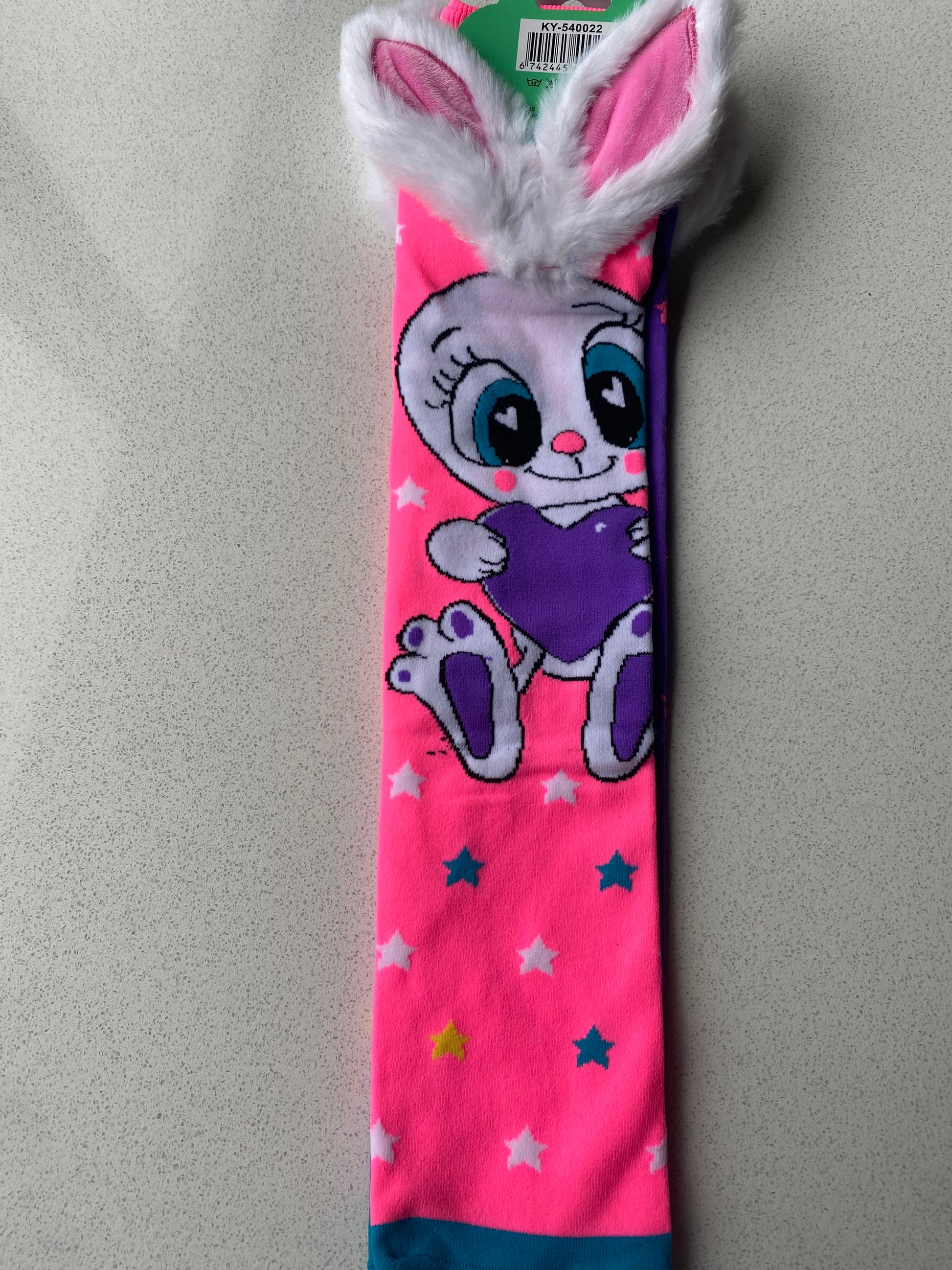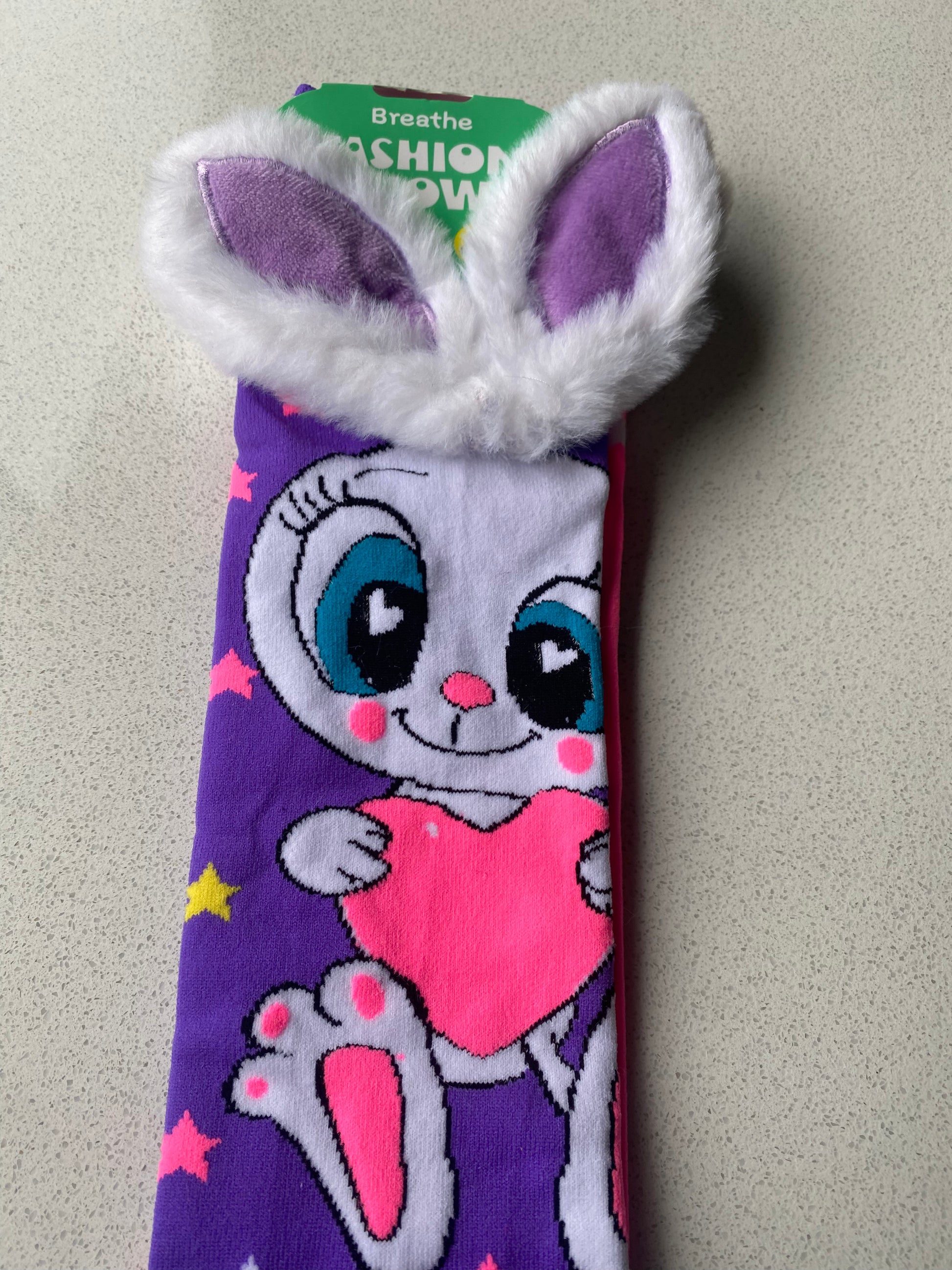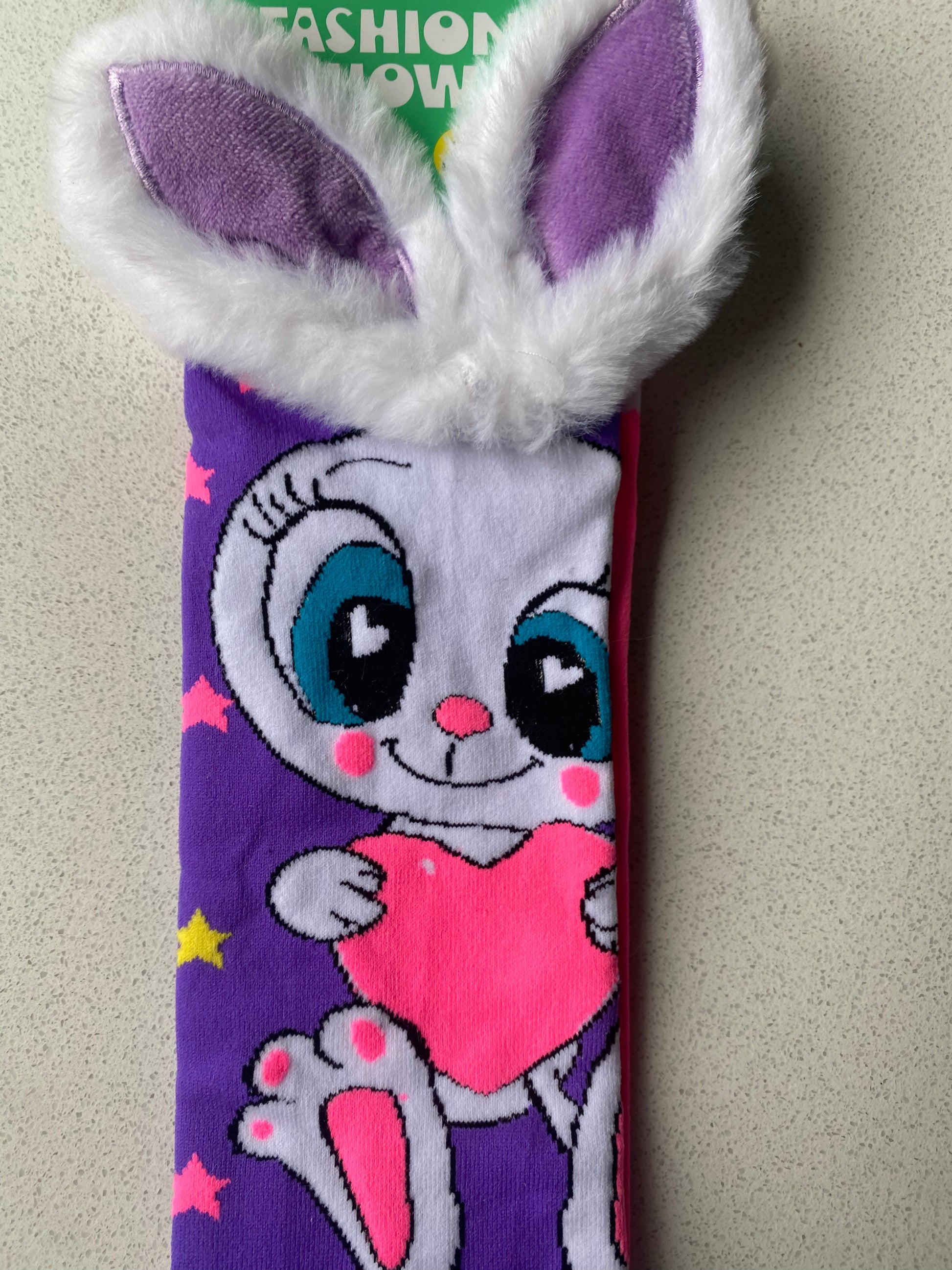 Añade un toque de dulzura y originalidad a tu look con estos encantadores calcetines de conejo. Su diseño con un tierno conejo que sostiene un corazón y estrellas brillantes, es perfecto para quienes aman los accesorios llenos de personalidad.